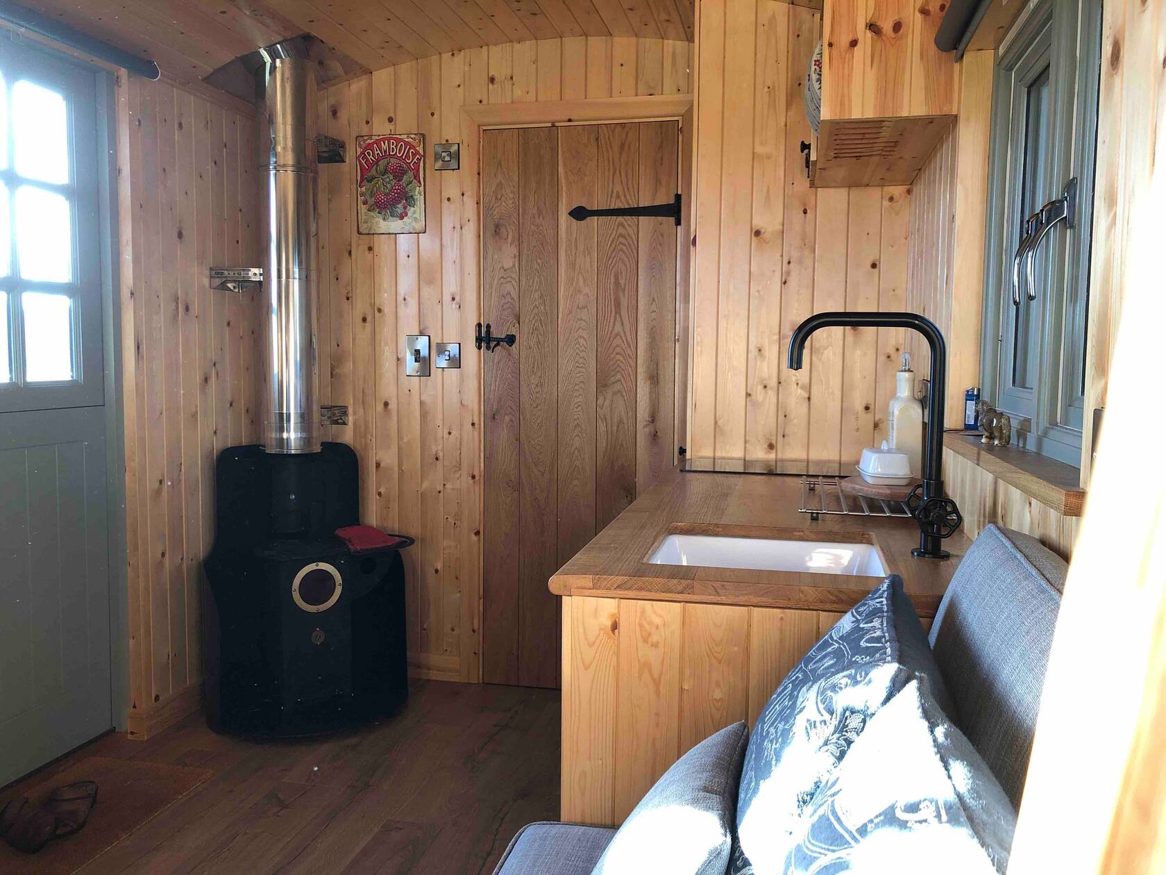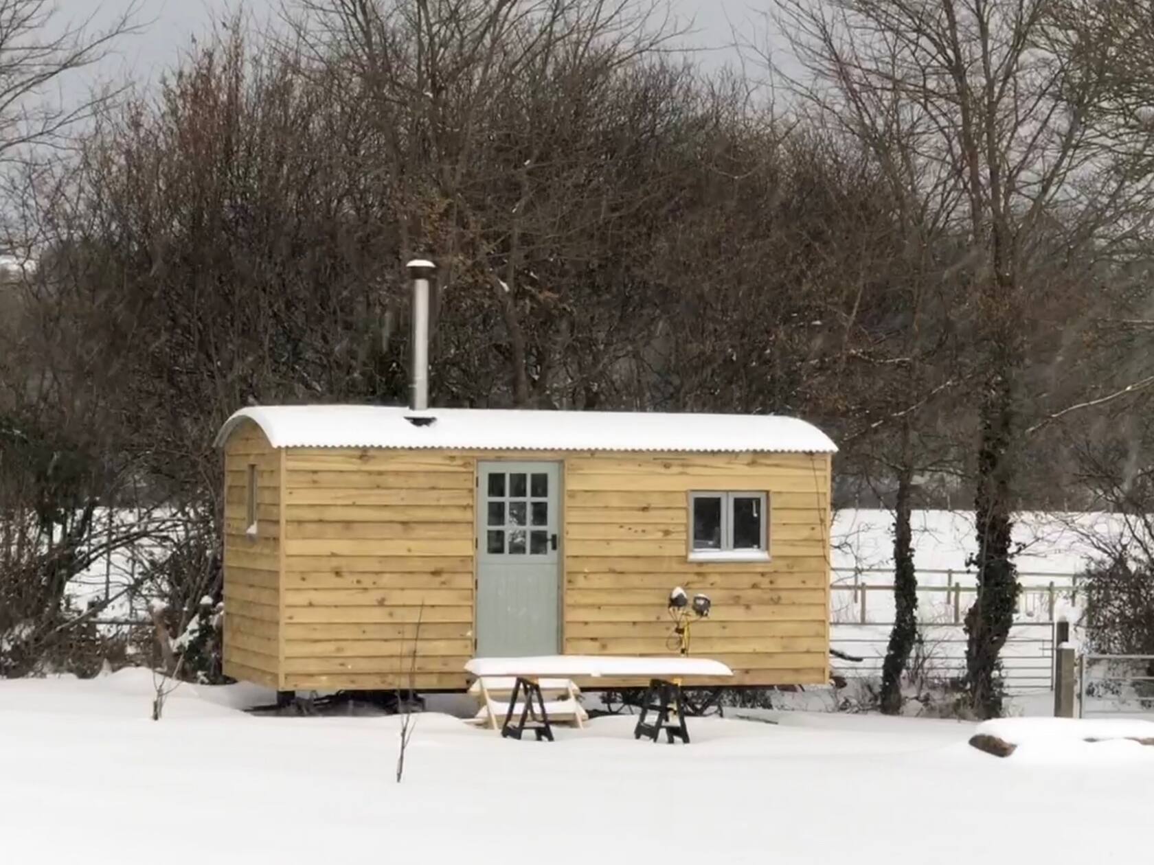 Luxury shepherds hut, en-suite shower room and wood burner, set in our new planted orchard. We run a licensed riding school and have many friendly horses and ponies. This is a fully self contained unit, well equipped with a full size fridge, icebox, two ring hob, smart tv, wifi and a cosy bed. There is a lovely outdoor space with table and chairs and a wood fired pizza oven. You are within walking distance of the village with wonderful pubs, eateries and takeaways.